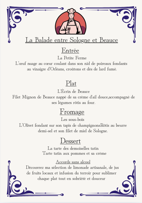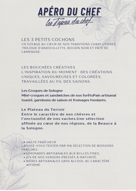 En attendant de vous proposer un accord mets et vins pour vous faire découvrir notre magnifique domaine viticole du Centre-Val de Loire, je vous invite à savourer une sélection de limonades artisanales, jus de fruits régionaux et infusions florales. Que ce soit à travers mon menu « La balade entre Sologne et Beauce » ou lors d’une prestation apéritive, partez avec moi à la découverte des trésors cachés de notre région, en succombant également à nos bières artisanales de caractère, sans alcool.